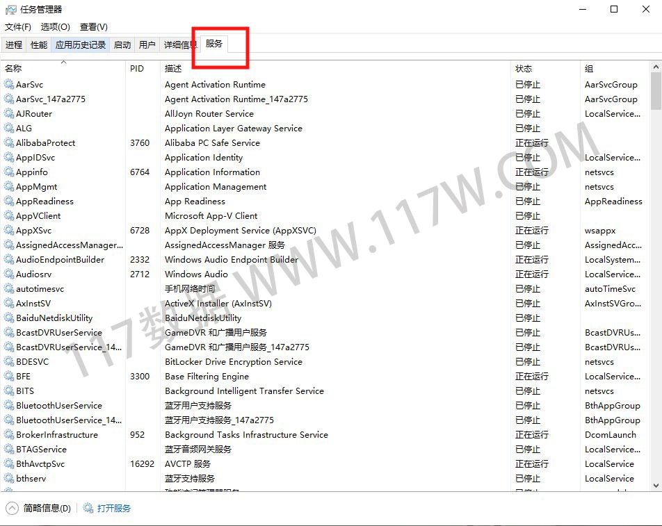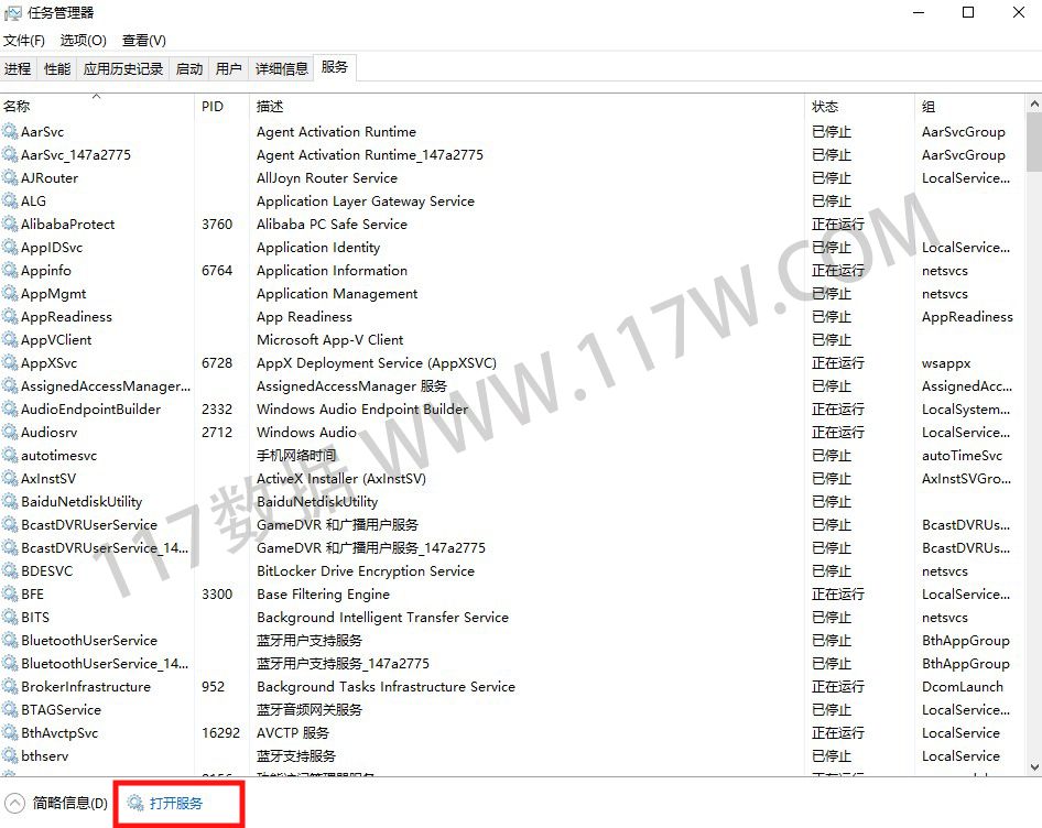 2.打开【任务管理器后】点击【服务】,在最下面点击【打开服务】(如下图所示)