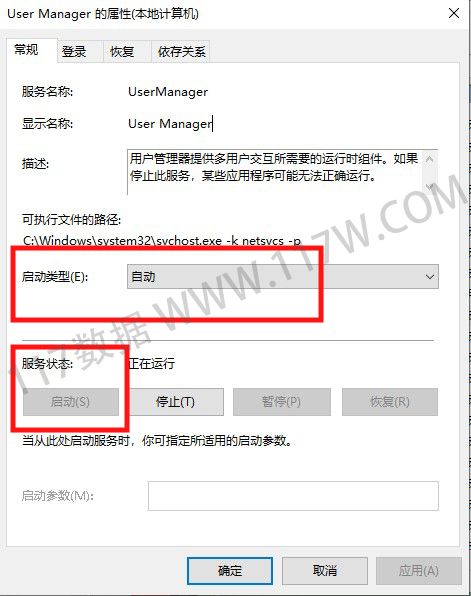 4.在User Manager配置界面中,点击启动按钮,然后将启动类型设置为【自动】模式,设置完成后点击【确定】按钮,最后重启计算机就解决啦。