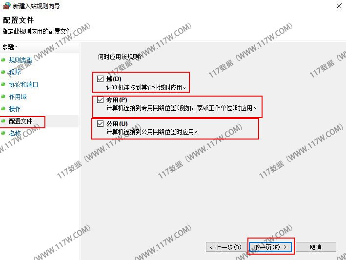 选择适用的配置文件【"域网络"、"专用网络"和"公用网络"】并点击下一步。(如下图所示)