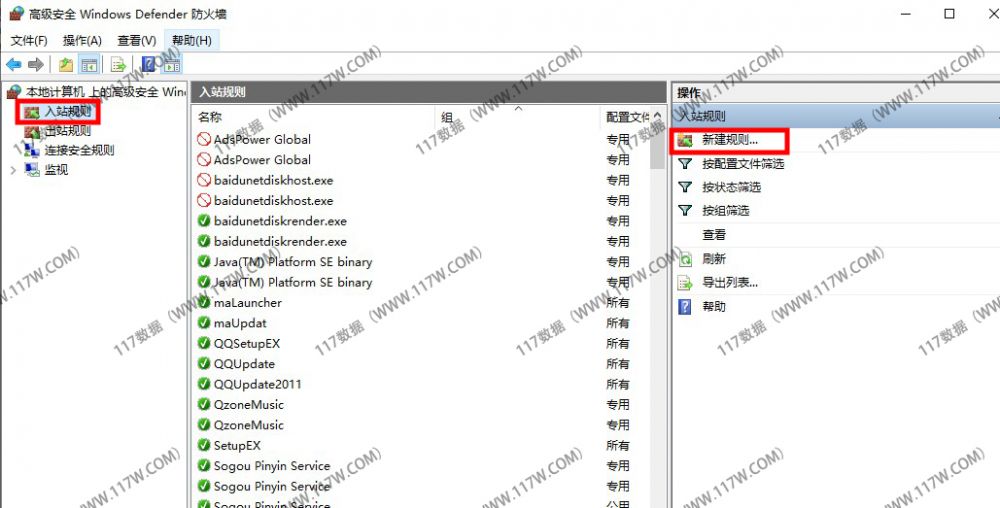 在高级设置窗口找到并点击【入站规则】,面板右侧点击【新建规则】。。(如下图所示)